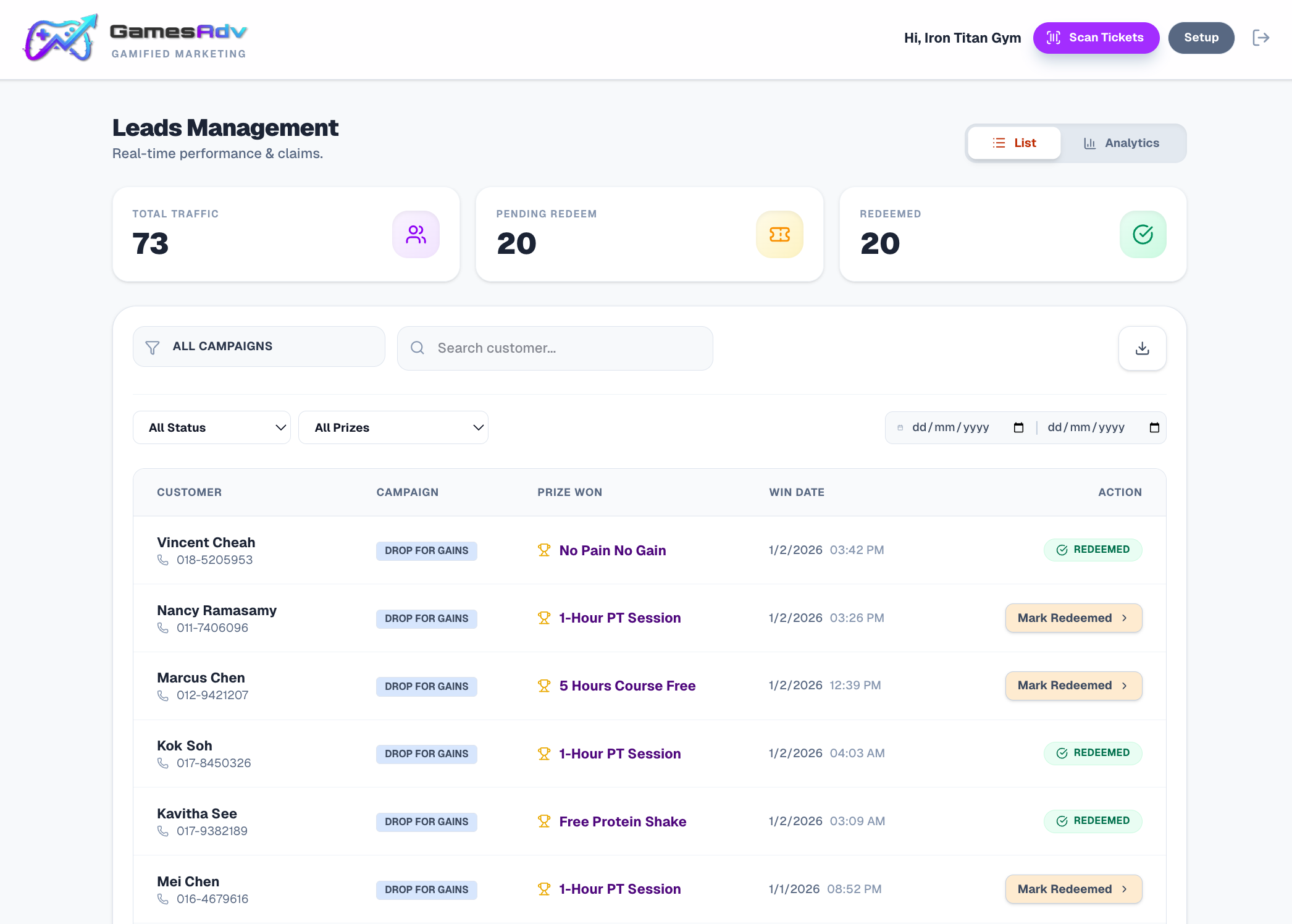 Players provide their Name & Phone number to generate a unique Redemption QR code when claiming prizes for build a high-quality CRM database.